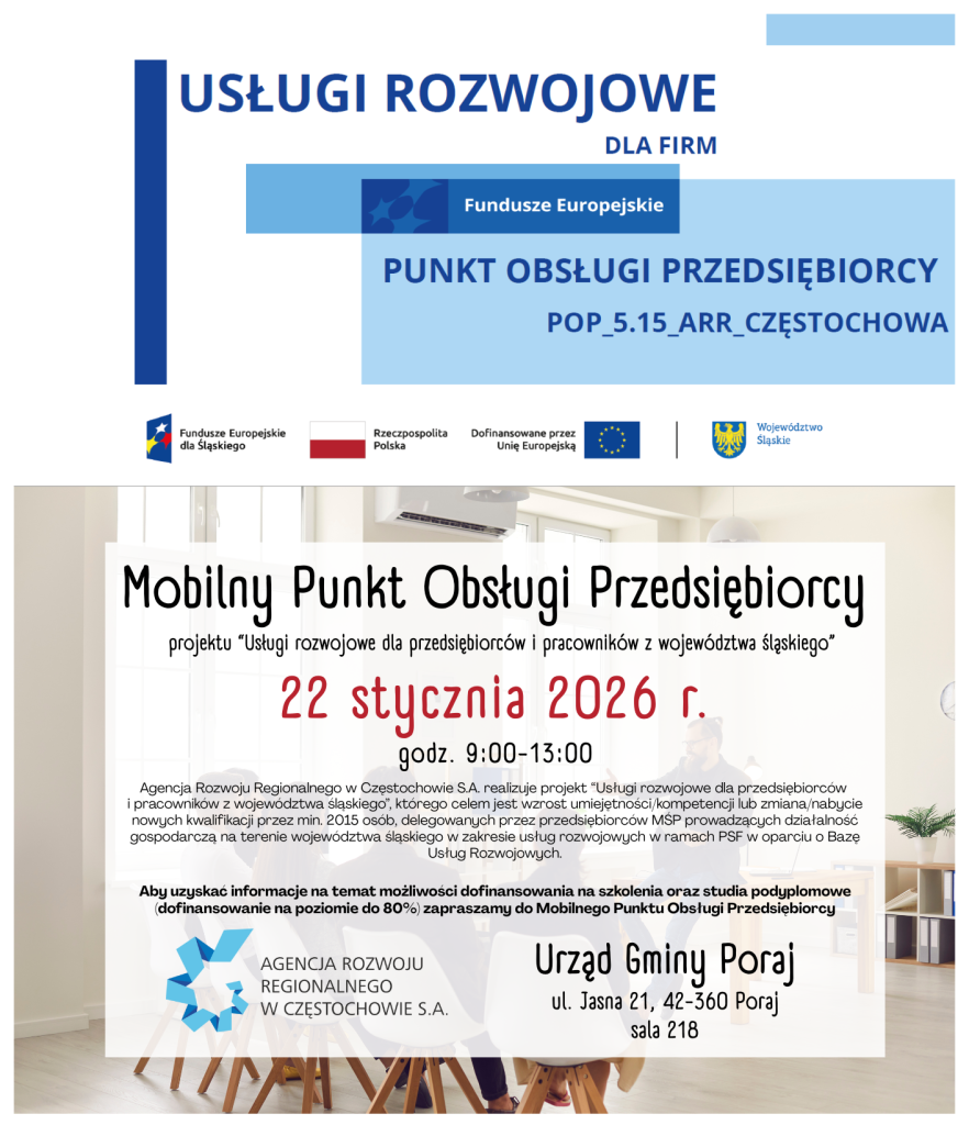 Informujemy, że Mobilny Punkt Obsługi Przedsiębiorcy projektu „Usługi rozwojowe dla przedsiębiorców i pracowników z województwa śląskiego”, będzie dla Państwa dostępny w dniu 22 stycznia 2026 r.