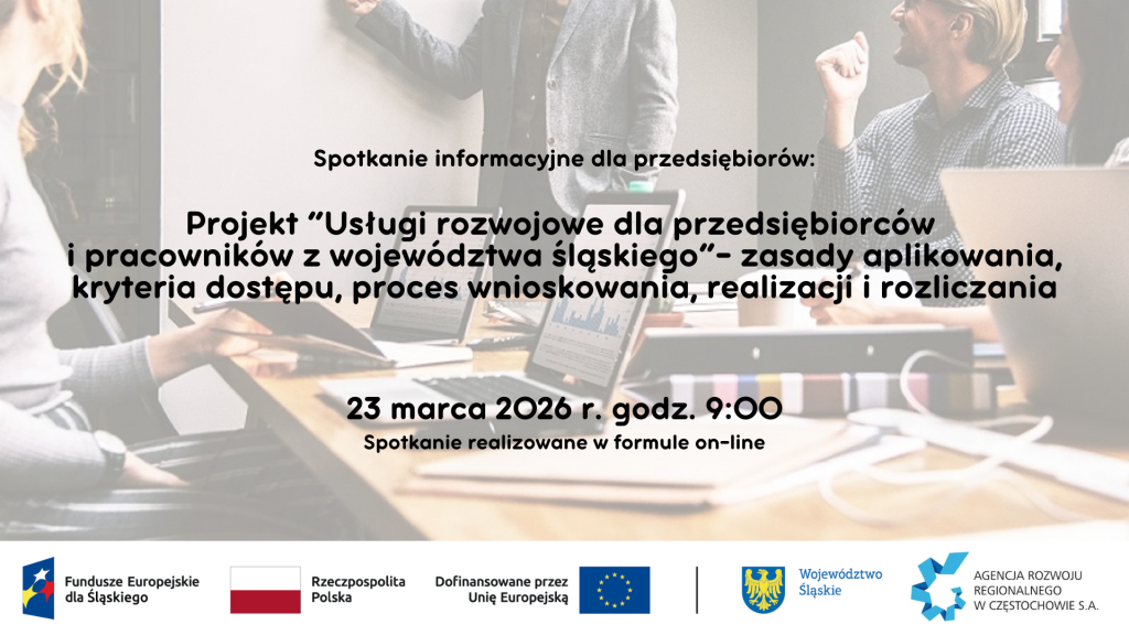 Serdecznie zapraszamy na bezpłatne spotkanie informacyjne dotyczące możliwości pozyskania wsparcia w ramach projektu „Usługi rozwojowe dla przedsiębiorców i pracowników z województwa śląskiego”.