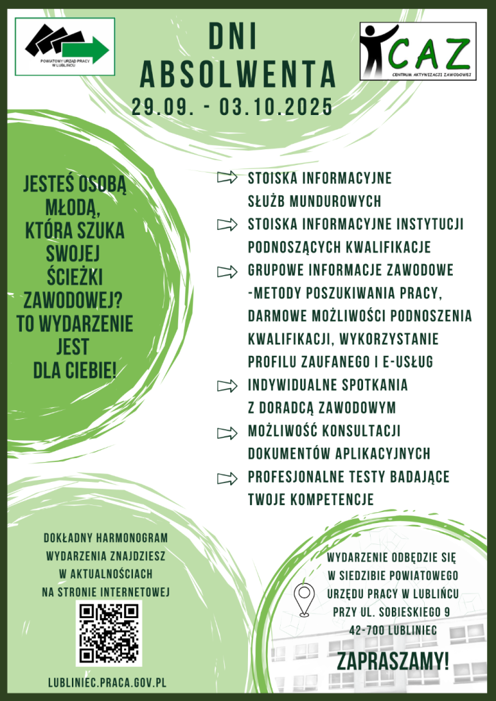 serdecznie zapraszamy do udziału w wydarzeniu Dni Absolwenta, które odbędzie się w siedzibie Powiatowego Urzędu Pracy w Lublińcu (ul. Sobieskiego 9, 42-700 Lubliniec).